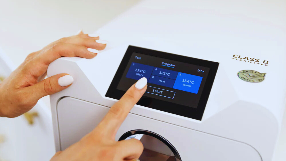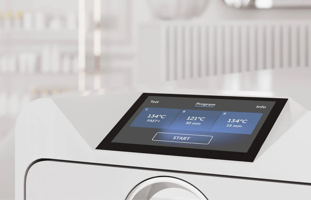 Der intuitive Touchscreen macht die Bedienung denkbar einfach – keine Einrichtung, keine Schulung, keine Einarbeitungszeit. Zwei einfache Fingertipps genügen, und der Sterilisationsprozess startet.